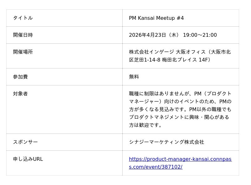 今回の勉強会では、関西を拠点とするPMが集い、プロダクト開発における課題解決や、顧客満足度(CX)を最大化するためのプロセスについて、LT(ライトニングトーク)や交流会を通じて議論します。