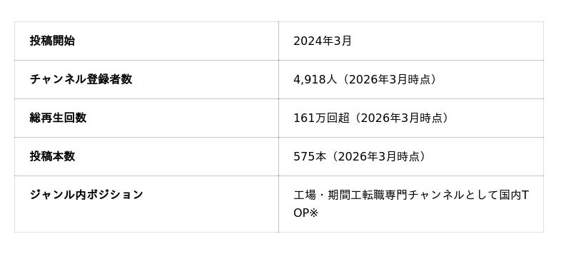 工場・期間工の日常を記録したvlogチャンネルは複数存在するものの、転職・求人情報に特化した専門チャンネルは国内にほぼ存在しない中、同チャンネルは2年間で投稿本数575本・総再生回数161万回超を達成。工場・期間工転職ジャンルにおいて国内トップ※のチャンネルとして成長しています。