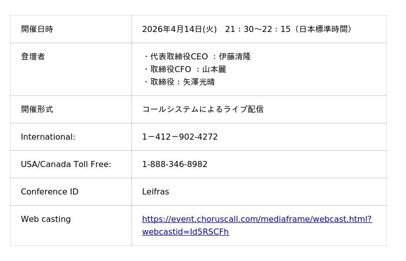 詳細については、当社ホームページ(https://ir.leifras.co.jp/)をご覧ください。
