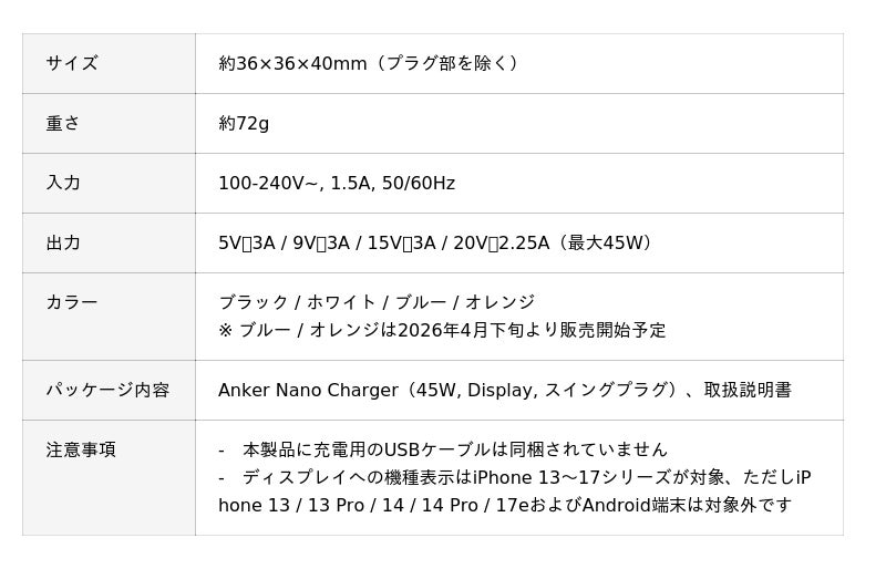 米国・日本・欧州を中心にデジタル関連製品でトップクラスの販売実績を誇るAnkerグループの日本法人、アンカー・ジャパン株式会社(本社:東京都港区、代表取締役CEO:猿渡 歩)は、5年連続で世界No.1モバイル充電ブランド(※)に認定された「Anker」において、USB急速充電器「Anker Nano Charger(45W, Display, スイングプラグ)」を2026年4月9日(木)よりAnker Japan 公式オンラインストア(特設ページ: