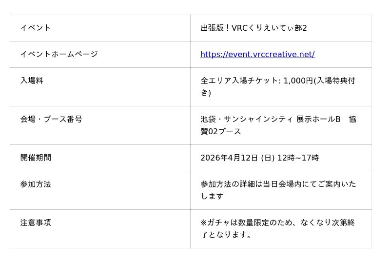 株式会社Vの出展するブースの中でもひときわ目を引くコンテンツが、全高2.0mを誇る巨大ガチャ筐体「ぶいっとMIX!ガチャ」です。無料でご参加いただける本企画では、VRChatライフを彩るデジタルアイテムから、手元に残る物理アイテムまで、多彩な景品をご用意しています。さらに、ハズレなしで景品が必ず当たる仕様となっており、VRChatユーザーの皆さまにお楽しみいただける内容となっています。参加方法の詳細は当日会場内にてご案内いたします。
