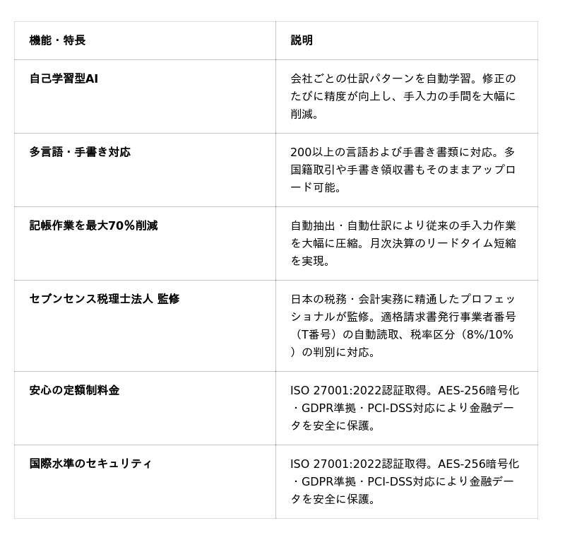 - 提供形態:月額定額制(ユーザー数・クライアント数無制限)- 対応会計ソフト:freee、マネーフォワード、弥生会計、Xero、QuickBooks、Zoho、MYOB、Sage、CSV出力 他- セキュリティ:ISO 27001:2022認証、GDPR準拠、PCI-DSS対応- 詳細・お問い合わせ: