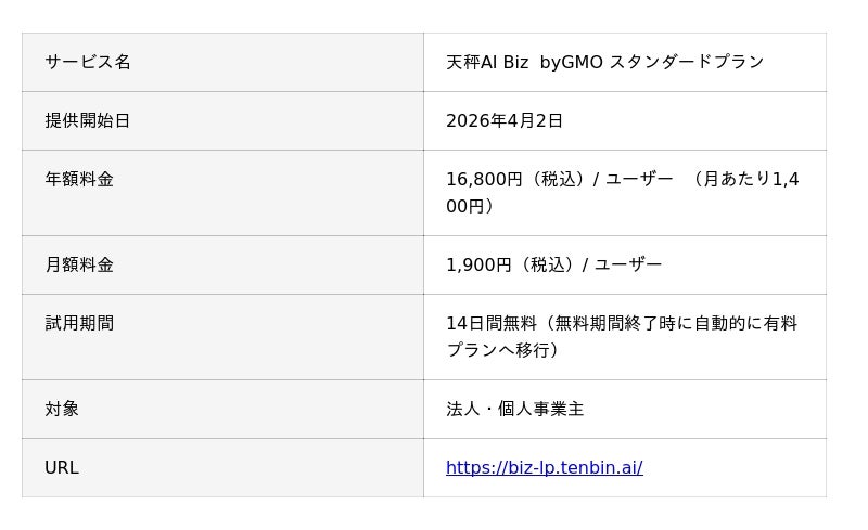 GMOインターネットグループのGMO天秤AI株式会社(代表取締役社長:山城 博規)は、2026年4月2日より、法人向けAIサービス『天秤AI Biz byGMO』において、サブスクリプション制「スタンダードプラン」の提供を開始しました。スタンダードプランは、年額16,800円(税込・月あたり1,400円)または月額1,900円(税込)の固定料金プランです。本プランは、固定料金で主要AIモデル(ChatGPT、Gemini、Claude等)を無制限にご利用できます(一部利用上限あり)。従来の「Bizプラン」における基本料金+従量課金と比較し、コストの範囲内で安心してAIを活用したい法人・個人事業主の方に最適なプランです。