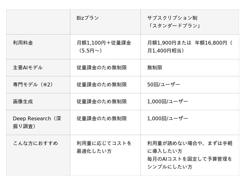 こうした課題にお応えするため、このたびサブスクリプション制「スタンダードプラン」の提供を開始いたしました。固定料金制の採用により、企業のAI活用における予算管理を容易にし、より多くの組織が安心してAIを日常業務に取り入れられる環境を整えます。