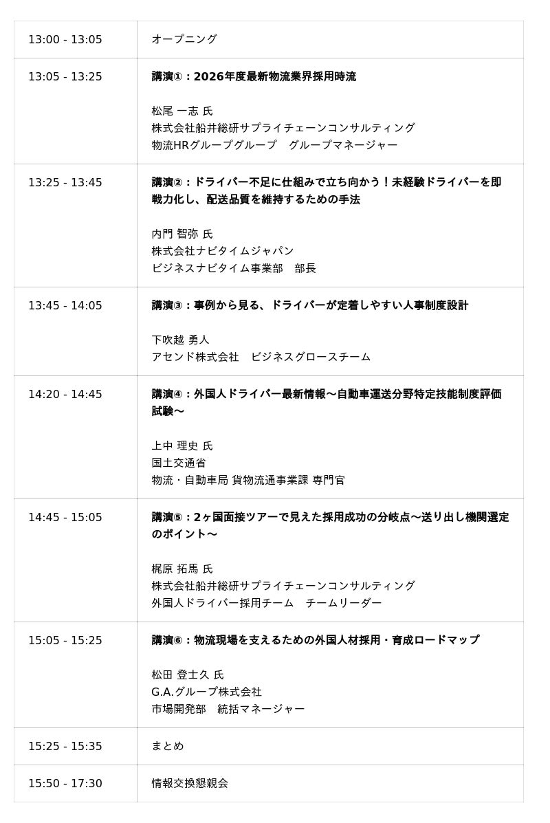 本セミナーでは、国土交通省による特定技能外国人ドライバー採用の最新制度解説や、船井総研サプライチェーンコンサルティングによる最新採用トレンド、ナビタイムジャパン等のDXソリューションを活用した早期戦力化の手法など、多角的な視点からドライバー採用・育成の最前線をお伝えします。