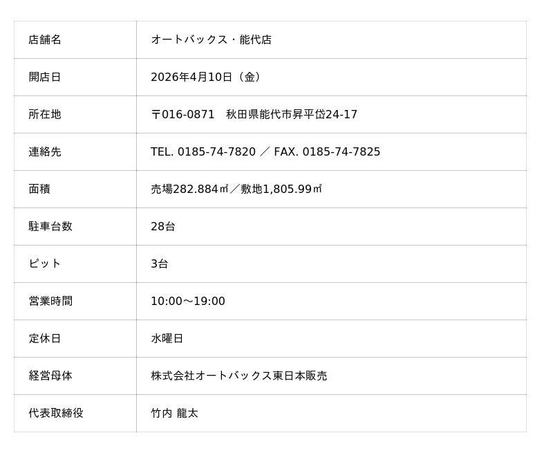 オートバックスセブン(代表取締役 社長:堀井勇吾)と加盟店契約を結んでいる株式会社オートバックス東日本販売(代表取締役:竹内 龍太)は、2026年4月10日(金)に「オートバックス・能代店」を新規オープンいたします。