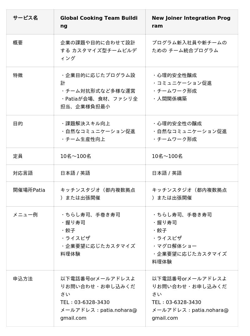 野原グループ株式会社 (本社:東京都新宿区、代表取締役社長:野原弘輔)が運営するレンタルキッチンスペース「Patia」は、料理体験を通じてチームの関係構築やコミュニケーション促進を支援する、完全カスタマイズ型・英語対応のチームビルディングプログラム「Global Cooking Team Building」「New Joiner Integration Program」を本日(2026年4月9日)より提供開始します。