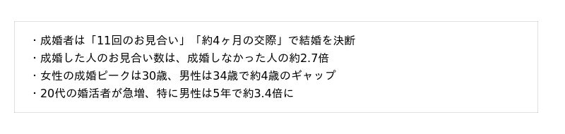 今後は、成婚を左右する「最適な決断のタイミング」や、結婚しやすい「男性のリアルな年収」など、これまで分析してこなかった視点でのデータを順次発表してまいります。