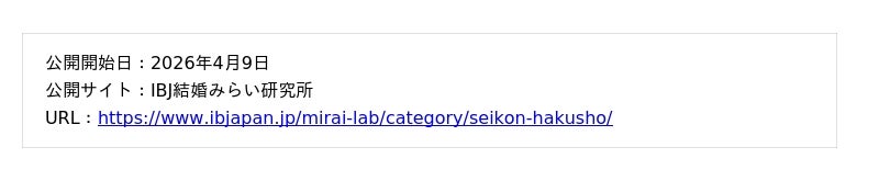 「2025年 IBJ 成婚白書」は、2026年4月9日(木)より、毎週木曜日・全15週にわたり公開予定です。