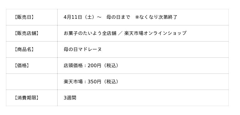 株式会社太陽社(所在地:千葉県匝瑳市飯倉293、代表取締役:片岡正裕)が展開する、千葉県で長年愛され続ける菓子店「お菓子のたいよう」は、母の日限定スイーツ第1弾となる「母の日マドレーヌ」を、4月11日(土)より発売いたします。