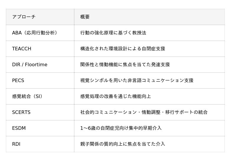 支援内容の生成には、施設が採用する療育アプローチを動的に選択・適用する Pluggable Architecture を採用しています。現在対応する8種のアプローチは以下のとおりです。