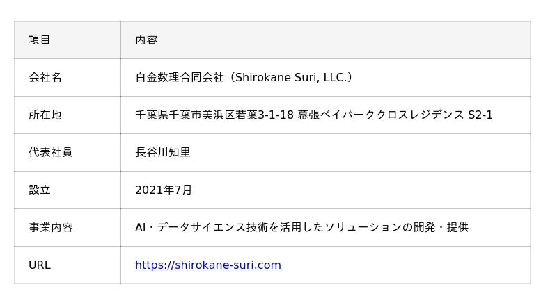 本稿で記載された技術は、白金数理合同会社により開発・実装されたものです。本技術に基づくシステムの利用、改変、第三者への提供等については、別途のライセンス・契約が必要となります。