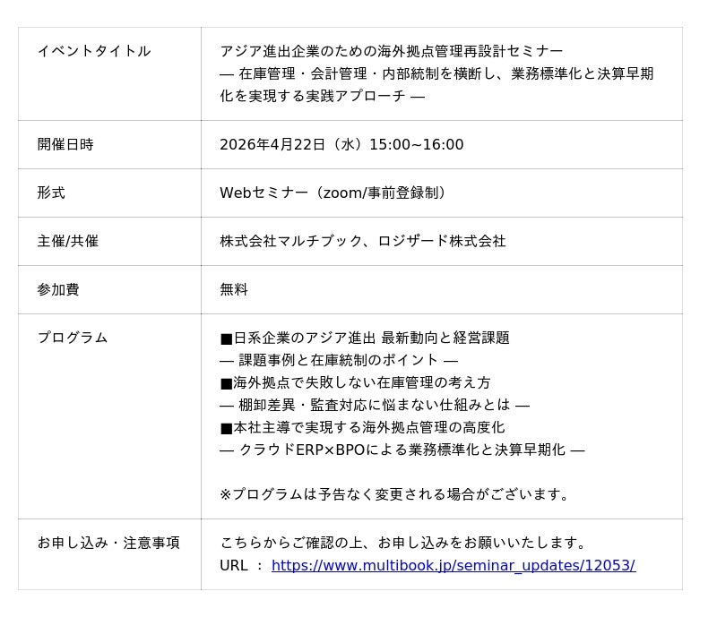 クラウド型在庫管理システムのリーディングカンパニーであるロジザード株式会社(東京都中央区、代表取締役社長:金澤 茂則、以下:ロジザード)は、株式会社マルチブック(東京都品川区、代表取締役社長:渡部 学、以下:マルチブック)とのWEBセミナー『アジア進出企業のための海外拠点管理再設計セミナー』を2026年4月22日(水)に開催決定、申し込み受付を開始しました。