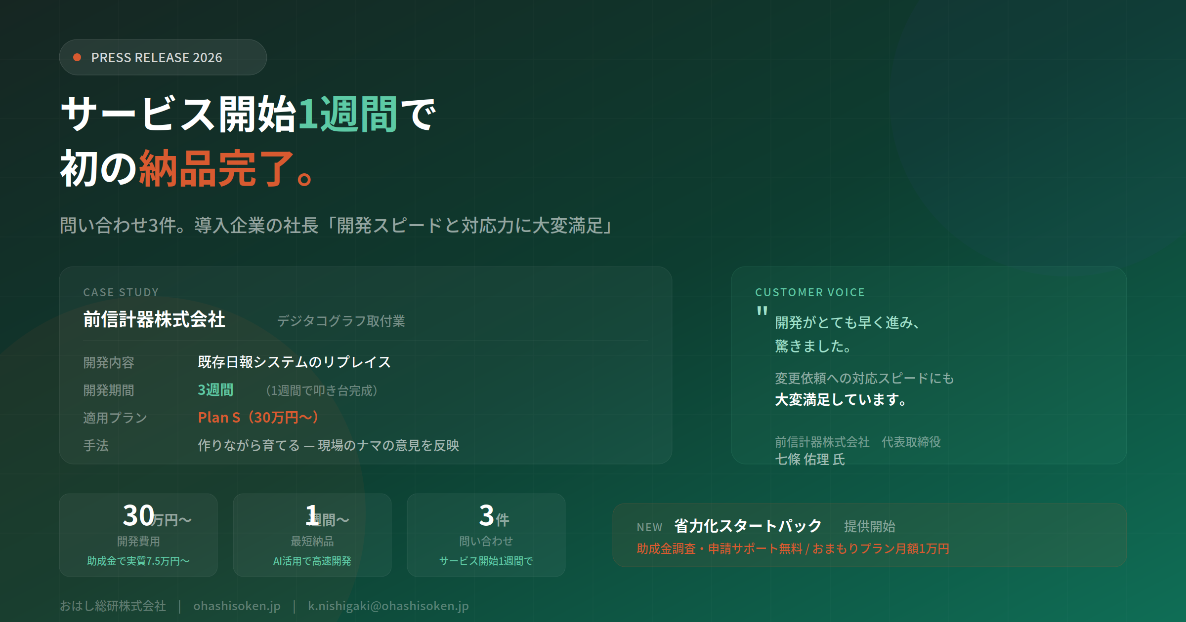 おはし総研株式会社(兵庫県丹波市、代表取締役:西垣勝貴)が4月1日に提供を開始した、AI技術を活用した中小企業向けWebアプリケーション開発サービスにおいて、サービス開始からわずか1週間で初の納品が完了し、問い合わせは3件に達しました。初の導入企業となった前信計器株式会社(デジタルタコグラフ取付業)の七條佑理社長からは「開発スピードと変更対応の早さに大変満足」との評価をいただいています。
