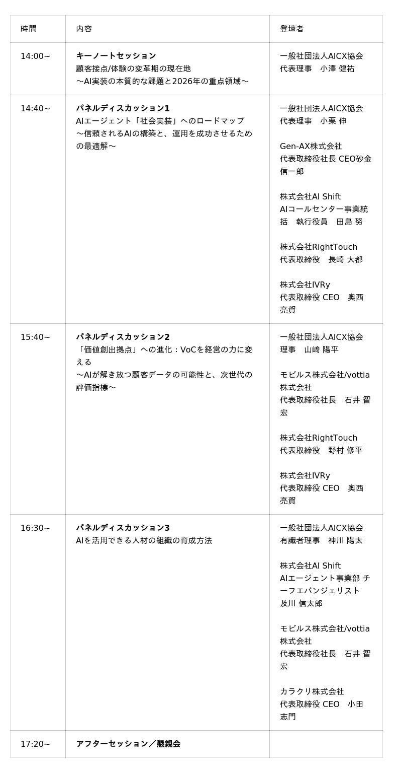- イベント名:AICX Frontier 2026 ~AIエージェントの社会実装と、顧客接点の価値再定義~- 開催日時:2026年5月19日(火)14:00~- 開催形式:オフライン開催- 会場:〒150-0002 東京都渋谷区渋谷2丁目24-12 渋谷スクランブルスクエア21F- 主催:一般社団法人AICX協会、株式会社AI Shift、株式会社IVRy、カラクリ株式会社、Gen-AX株式会社、株式会社RightTouch、モビルス株式会社/vottia株式会社(順不同)