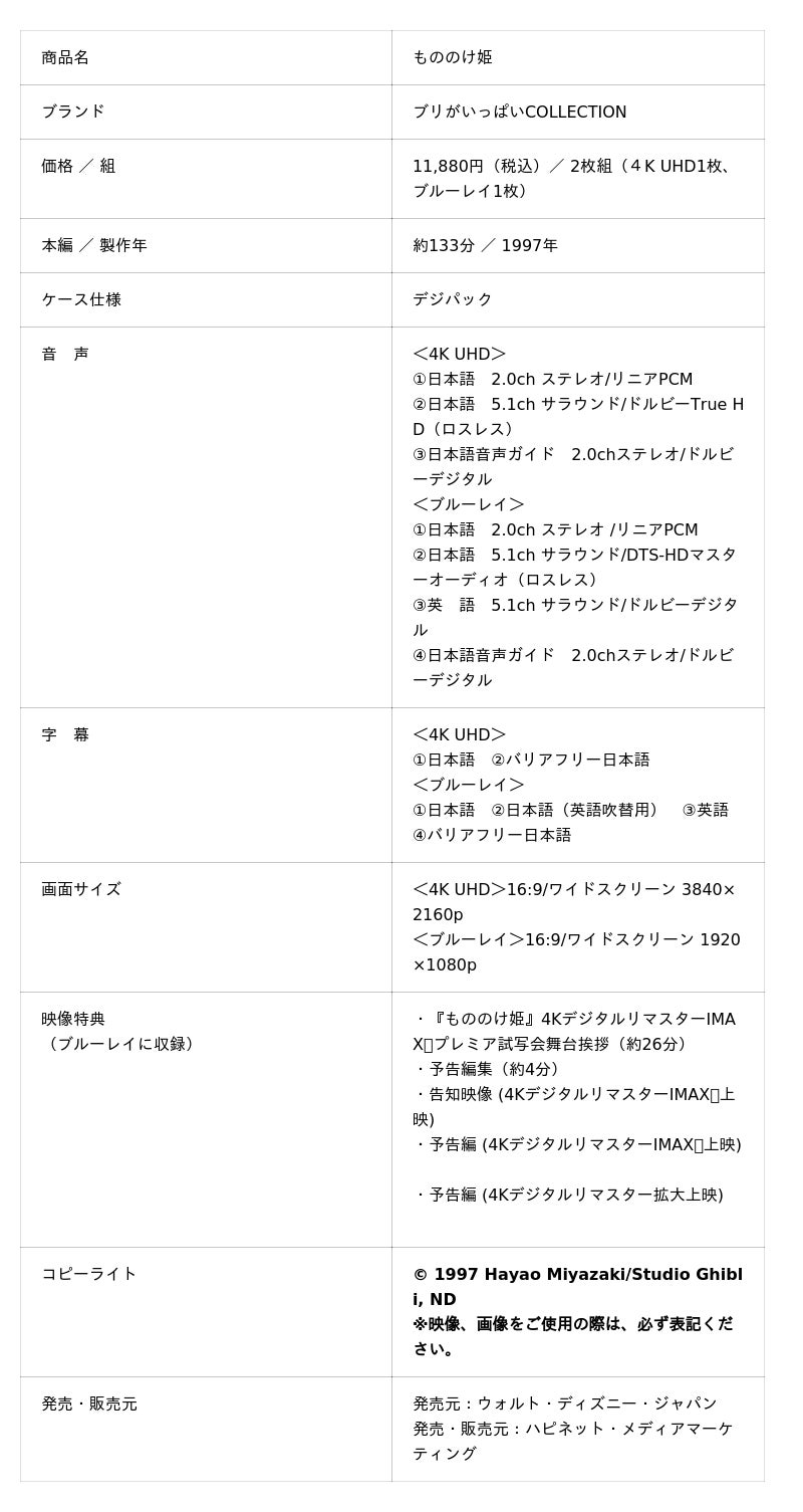 2025年3月に北米で、続いて同年10月からは日本国内でもIMAX(R)劇場上映され大ヒットを記録し大きな話題を集めた『もののけ姫』の4Kデジタルリマスター版が、待望の4K UHDで登場します。スタジオジブリ長編作品としては『君たちはどう生きるか』に続く4K UHD化となり、同様の新たなマスターで制作されたブルーレイとの2枚組仕様となります。