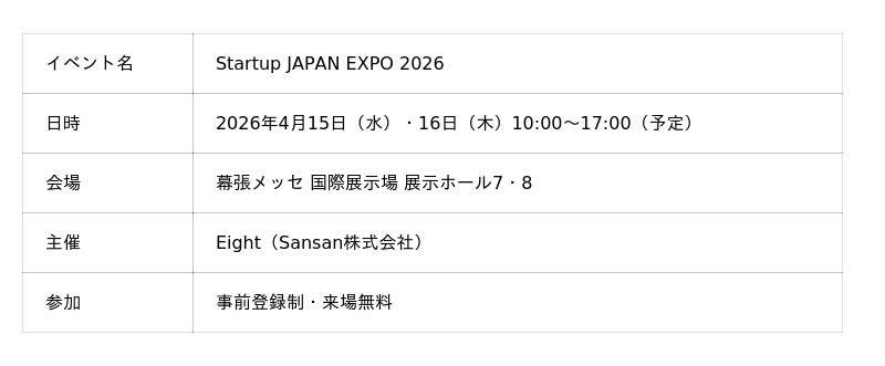 株式会社日商保(本社:東京都港区西新橋、代表取締役社長:豊岡 順也)は、2026年4月15日(水)・16日(木)に幕張メッセにて開催される「Startup JAPAN EXPO 2026」(主催:Eight/Sansan株式会社)に出展します。