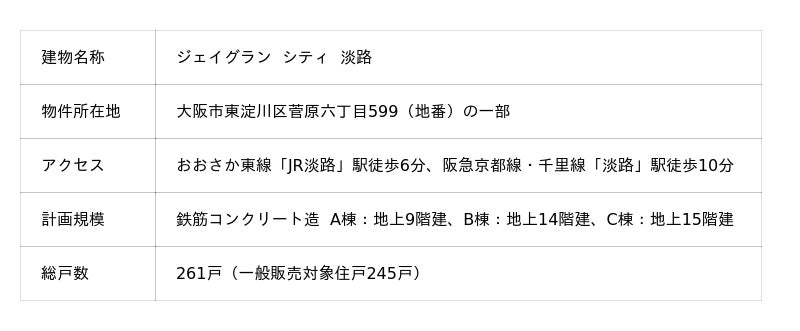 JR 西日本不動産開発株式会社(本社:大阪市北区中之島⼆丁目 2 番 7 号、代表取締役社長:藤原 嘉人)と 大阪ガス都市開発株式会社(本社:大阪市中央区平野町四丁目 1 番 2 号、代表取締役社長:橋口 博一)は再開発が進む淡路エリアにて進行中の大規模マンションプロジェクト「ジェイグラン シティ 淡路」についてお知らせいたします。