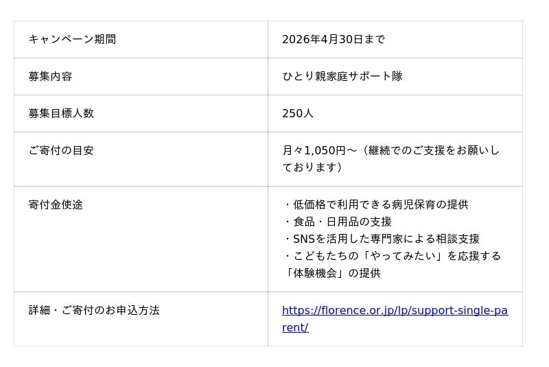 この支援使途拡大を記念し、2026年4月30日まで「ひとり親家庭サポート隊員」を250人募集するキャンペーンを実施いたします。