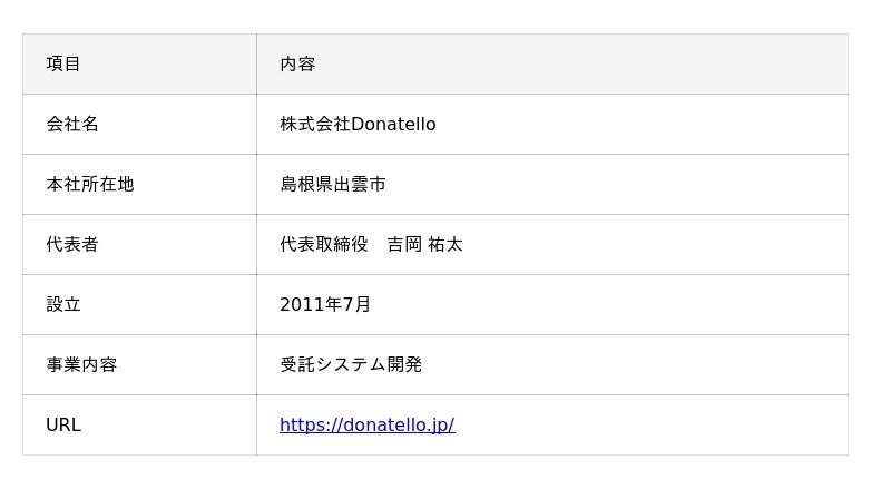 Donatelloは「DEVELOP FOR THE FUTURE.」を掲げ、受託システム開発を通じモダンな技術で顧客課題に向き合ってきたソフトウェア開発ベンダーです。出雲市にもオフィスを構え、地域ITエコシステムの担い手として実績を積み重ねています。