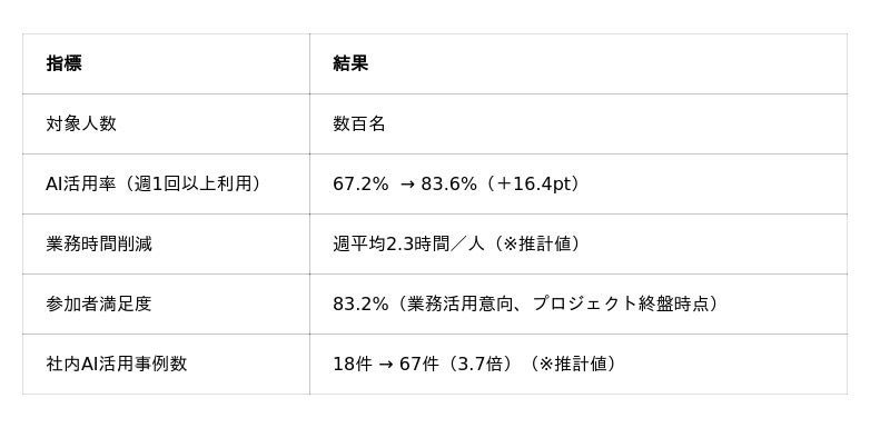 プロジェクト設計から社内展開・定着化まで一貫して支援した結果、以下の成果を達成しました。