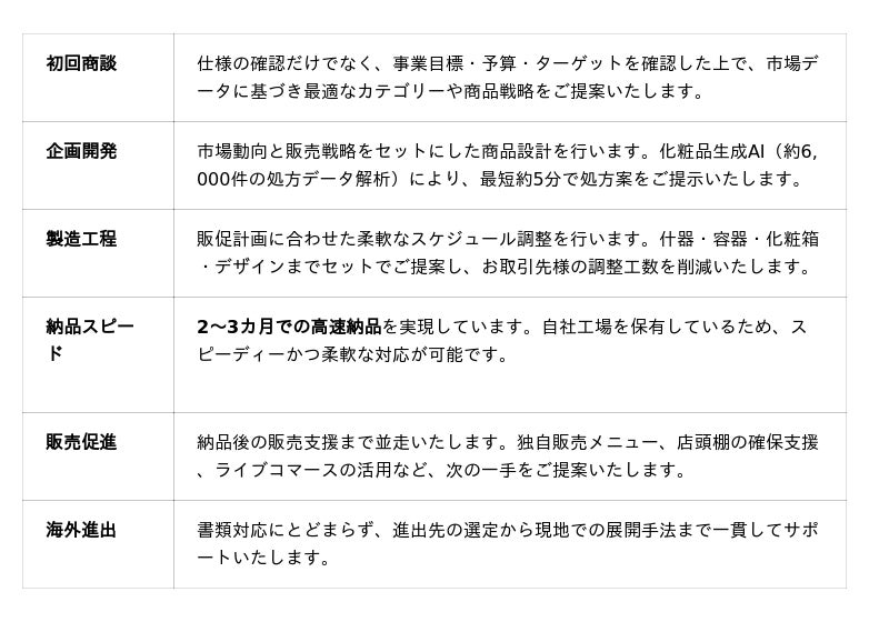 当社は化粧品OEM/ODMメーカーです。商品の企画開発から製造、販路開拓、販売グロース、海外進出まで、ブランド事業のあらゆるフェーズに並走する体制を整えています。