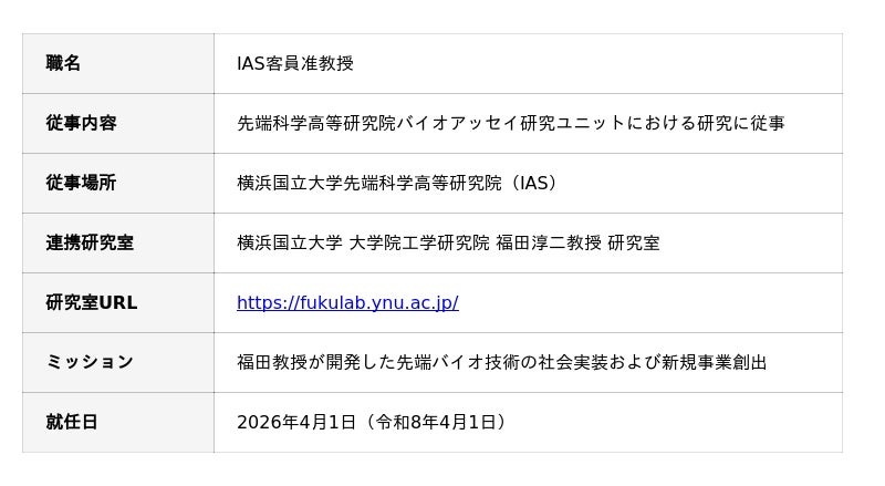 清水氏は、2026年4月1日より横浜国立大学先端科学高等研究院(Institute of Advanced Sciences、以下IAS)のバイオアッセイ研究ユニットに客員准教授として従事します。同ユニットの主任研究者である福田淳二教授が有する、3D細胞培養や再生医療領域における革新的な研究シーズを核とした、スタートアップとして事業化することをミッションとして担います。