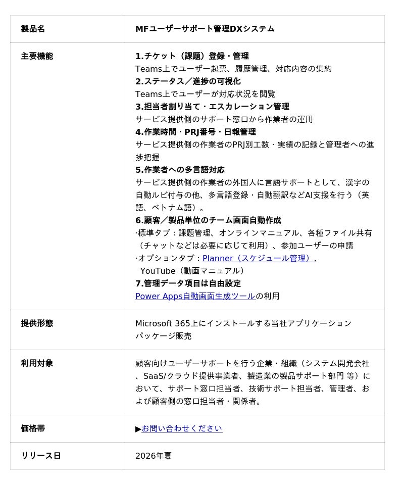 当社はこの環境に着目し、日常的に使われている Teams を窓口として、問い合わせ(チケット)管理とドキュメント共有を一体化し、無理なく運用を継続できるサポート業務の標準化を実現する仕組みとして、「MFユーザーサポート管理DXシステム」を2026年夏に提供開始します。