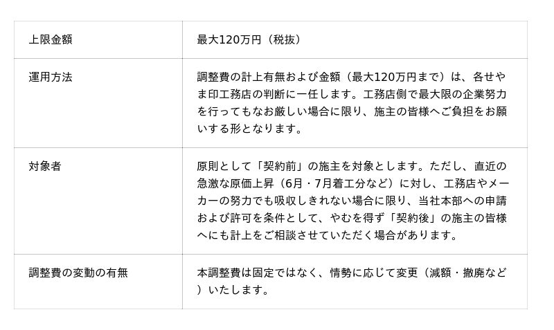 当社としては、施主の皆様に新たな負担をお願いすることは大変心苦しく、これまで誠意をもって価格維持に努めてまいりました。しかしながら、施主の皆様がこれ以上の不安を抱えることなく安心して家づくりを進められるようにするとともに、せやま印工務店の経営圧迫による倒産リスクを防ぐという両者を確実に守り抜くための苦渋の決断として、いち早く追加費用の上限を定めるルール変更をいたしました。