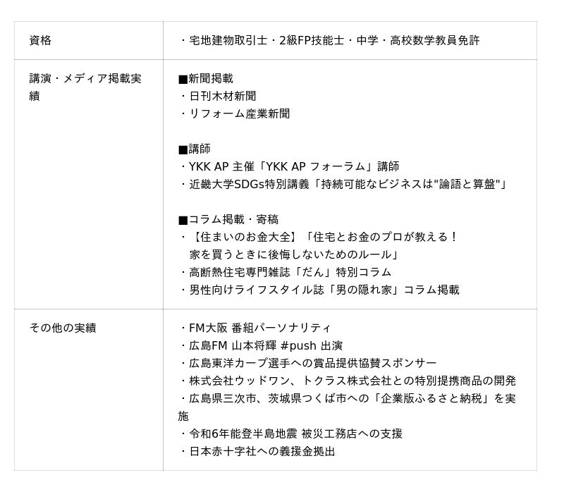 大学卒業後、日本最大手経営人事コンサルティング会社にて、全国ハウスメーカー・工務店を担当。住宅業界で手腕を振るう中、住宅業界の悪しき文化に疑問を覚え、家づくりの新たなスタンダードの確立を目標に掲げる。 その後、中堅ハウスメーカー支店長経験を経て、2019年に独立。