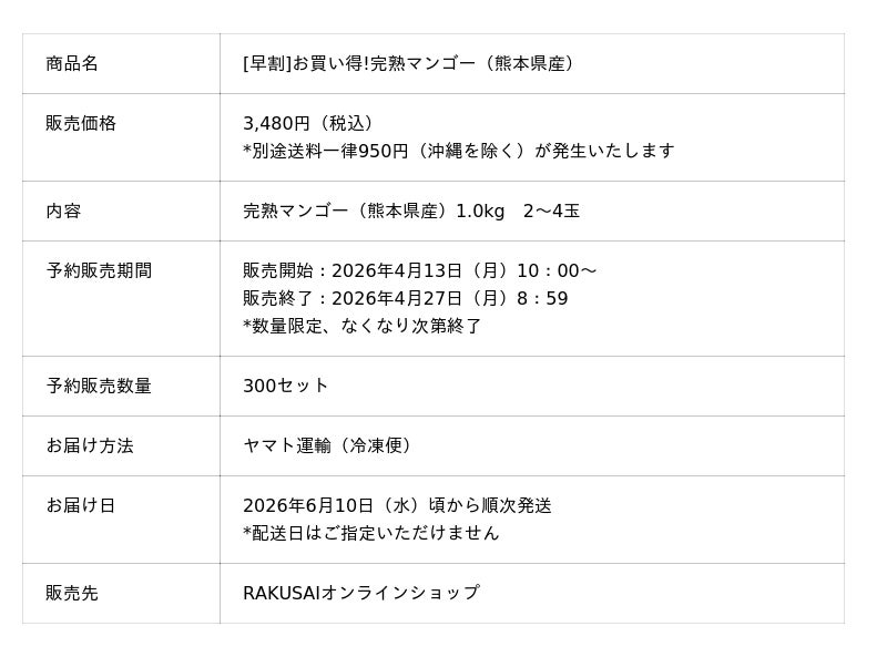 d130004-134-f7c5e891e8b2a6d566d3debb56017280.pdf 楽彩株式会社(本社:東京都足立区、代表取締役社長:大崎善保)は、2026年4月13日(月)より[早割]お買い得!完熟マンゴー(熊本県産)を300セット限定で予約販売いたします。大好評の熊本県産完熟マンゴー。収穫最盛期となる6月出荷分を、一足早くお買い得価格でご用意しました!「今だけ500円OFF」で手に入るのは、この先行予約期間だけ。数量限定、なくなり次第終了の早い者勝ちです。カレンダーのチェックをお忘れなく!