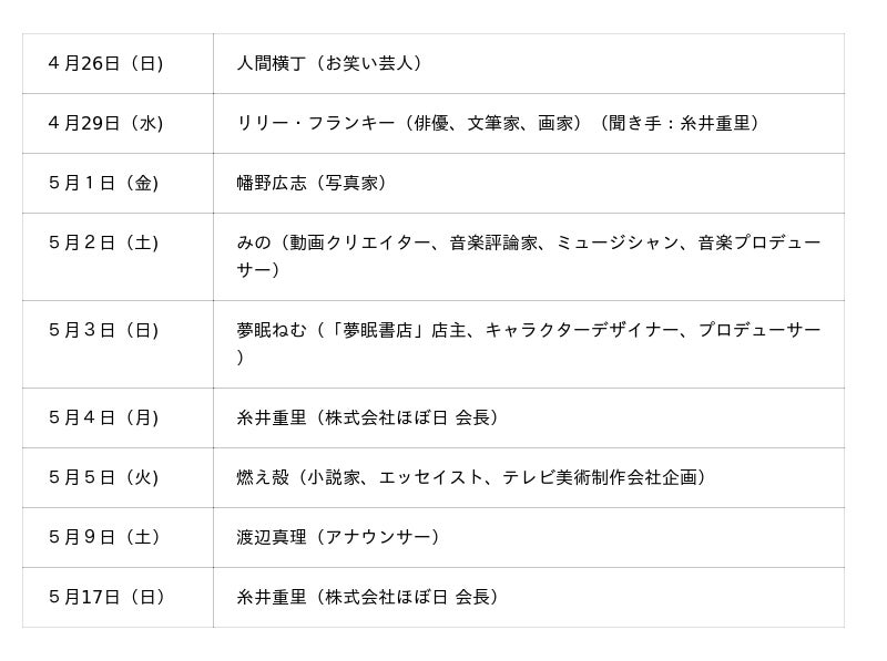 また、会期中、同会場では夜7時から、トークイベントを十数回ひらきます。「わたしの5曲」をテーマに人間横丁さん、リリー・フランキーさん、幡野広志さん、みのさん、夢眠ねむさん、燃え殻さん、渡辺真理さん、糸井重里など多方面で活躍するゲストの方々が選んだ昭和の曲を、お話をまじえながらみんなで聴く、わくわくの時間です。豪華ゲストをお招きする日(有料)と、ほぼ日のスタッフがお話しする日があります。