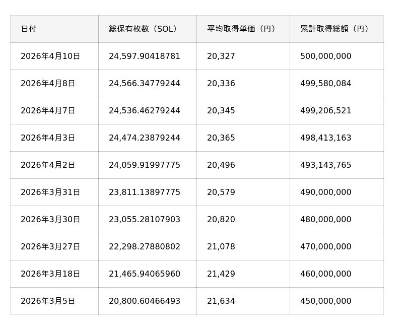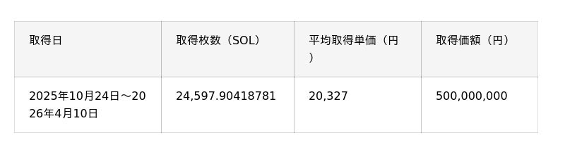 2025年10月に開始したソラナ・トレジャリー事業は、当初のマイルストーンである累計取得金額5億円に到達いたしました。