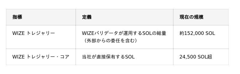 当社はソラナ・トレジャリー事業の成長指標として「WIZEトレジャリー」と「WIZEトレジャリー・コア」の2つを設定しています。自社で保有するSOLが増えるほどステーキング報酬が拡大し、外部から預かるSOLが増えるほどバリデータ報酬が拡大します。これらの報酬はすべてSOLで受け取るため、保有SOLがさらに増加する好循環が生まれる構造です。