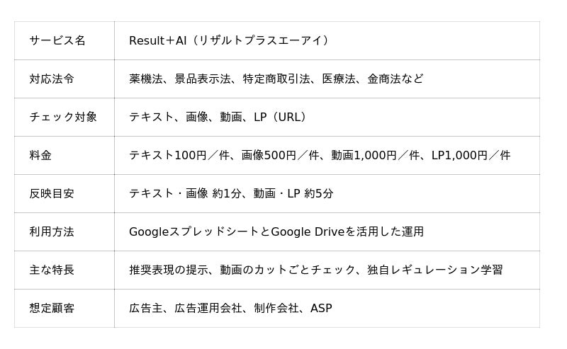 「Result+AI」は、テキスト、画像、動画、LP(URL)を対象に、案件内容に応じた法令チェックを行います。料金はテキスト100円/件、画像500円/件、動画1,000円/件、LP1,000円/件から。従来、LP1本あたり数万円かかるケースがあった法令チェックのコストを大幅に抑えることが可能です。