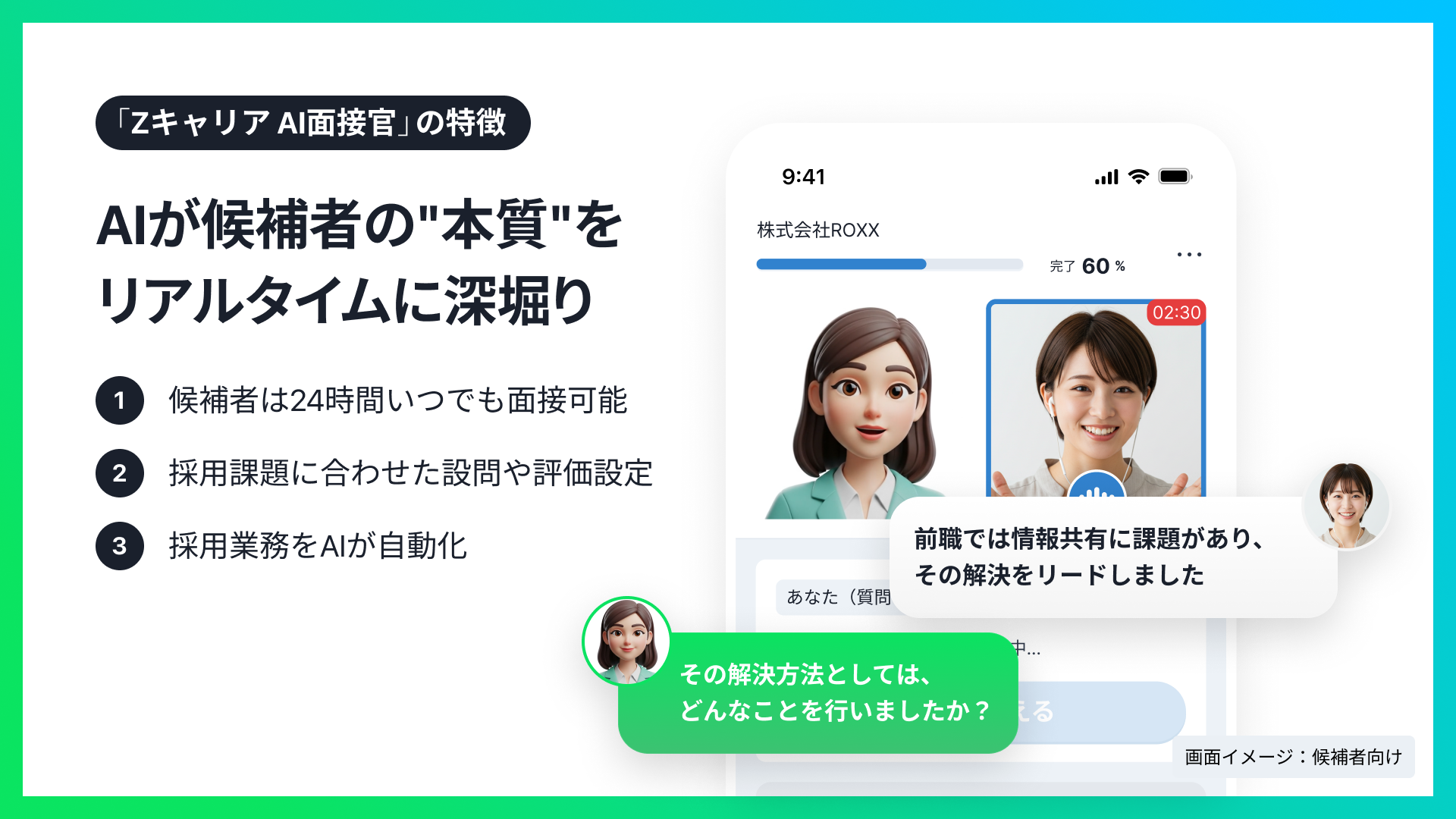 『Zキャリア AI面接官』は、採用活動の一部をAIが担うことで、面接工数の削減や選考リードタイムの短縮を可能にする採用支援サービスです。