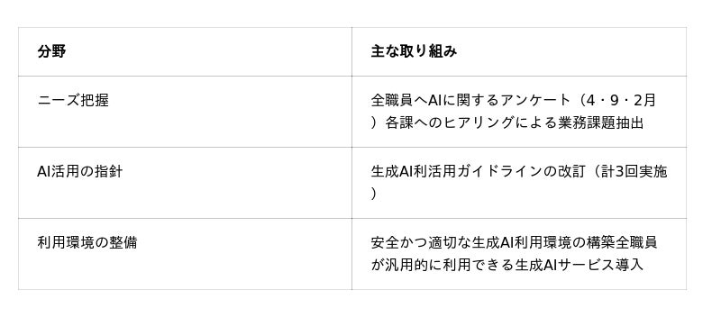 令和7年4月に発足したAI活用推進課を中心にニーズの把握、指針の策定、利用環境の整備などを行い全庁的なAI活用を推進しました。