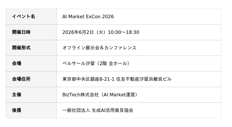 最適なAI会社やAIサービスの選定を支援するコンシェルジュサービス「AI Market」を運営するBizTech株式会社(東京都豊島区、代表取締役 森下 佳宏)は、2026年6月2日(火)に開催する、AI特化展示会&カンファレンス『
