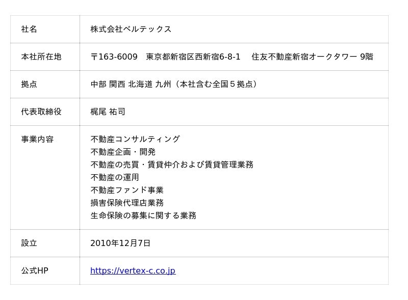 株式会社ベルテックスは、『より多くの人々の不安を「夢」や「希望」に変える』を企業理念に掲げ、お客様のニーズに沿った不動産コンサルティング、不動産企画・開発、不動産の売買・賃貸仲介および賃貸管理業務、不動産の運用、損害保険代理店業務、生命保険の募集に関する業務を提供する総合不動産カンパニーです。