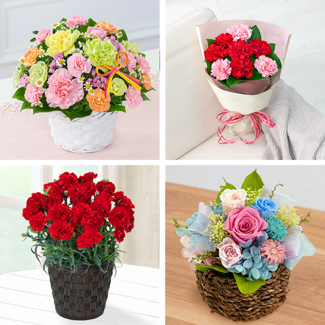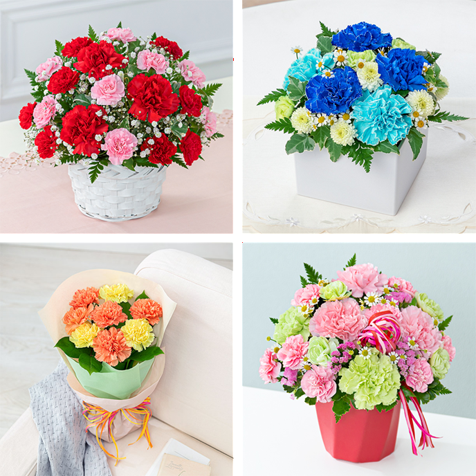 アンケートで人気となった「赤」、今年初めて登場するカラー「青のカーネーション」を使用したギフト、そして、黄色オレンジ、ピンクなどお母さんのイメージや好み、推しカラーに合わせて選べる多彩なバリエーションをご用意。お母さんの個性にぴったりの花が見つかります。