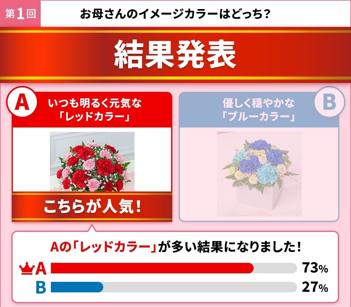 「お母さんのイメージカラー」のアンケート結果は、赤系が73%、青系が27%となりました。赤を選んだ理由は「明るい」「元気」といった王道のイメージが中心です。一方で「お母さんが推しているアイドルのメンバーカラーだから」や「お母さんのイメージは赤。自分用には青が欲しい」いった声も見られ、“推し活”や“自分へのご褒美”といった、新しい贈り方の視点もうかがえます。