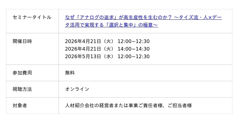 本セミナーでは、株式会社タイズにて第二営業部部長・マーケティング部マネージャーを務める中田昌吾氏がご登壇。あえてアナログを追求し直近2年間で売上を2.5倍にまで急成長させることに成功してきた同社が、どのように高い生産性を実現しているのか? これからの紹介エージェントが目指すべき「人×データ」の勝ちパターンを紐解いていただきます。
