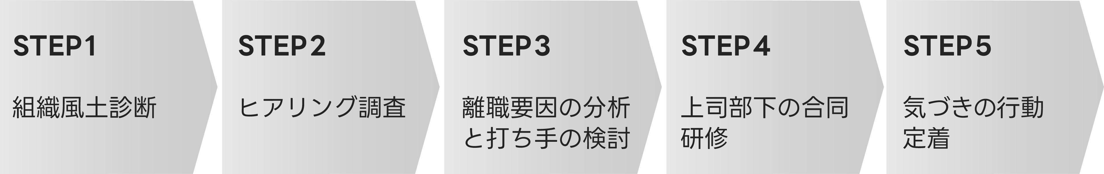 離職防止の取り組みは以下のステップで進めました。まずは組織風土診断によって、メンバーの関係性を見える化し、離職要因を考察しました。次に組織の実情を把握するために、気になる数名に絞ってヒアリング調査を実施。これらを材料に離職要因を掘り下げて分析し打ち手を提案しました。今回は「上司と部下のコミュニケーション不足」が主な離職要因の一つでしたので、上司と部下を交えた合同研修を実施して、お互いの相互理解を深めました。その後、1on1面談を数ヵ月継続して、研修での気づきを定着させました。