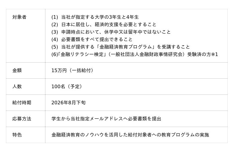“みらい応援奨学金”では、当社が掲げる「社会的価値の追求」を実現するため、給付型奨学金による経済的支援と、当社が培ってきた金融経済教育のノウハウを活用した教育プログラムを提供します。この取組を通じて、当社は若い世代に生き抜く力を身に付ける機会を提供し、持続可能な社会の発展に貢献したいと考えます。