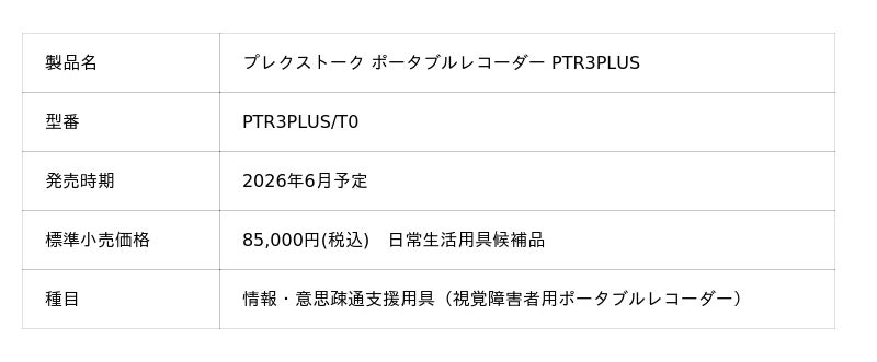 シナノケンシ株式会社(本社:長野県上田市、代表取締役社長:金子 行宏、以下「シナノケンシ」)はこのたび、視覚障がい者向けの録音再生機「プレクストーク」シリーズの新製品として、卓上型録音再生機 『PTR3PLUS』(読み:ピー・ティー・アール・スリー・プラス)を開発し、2026年6月より販売を開始します。