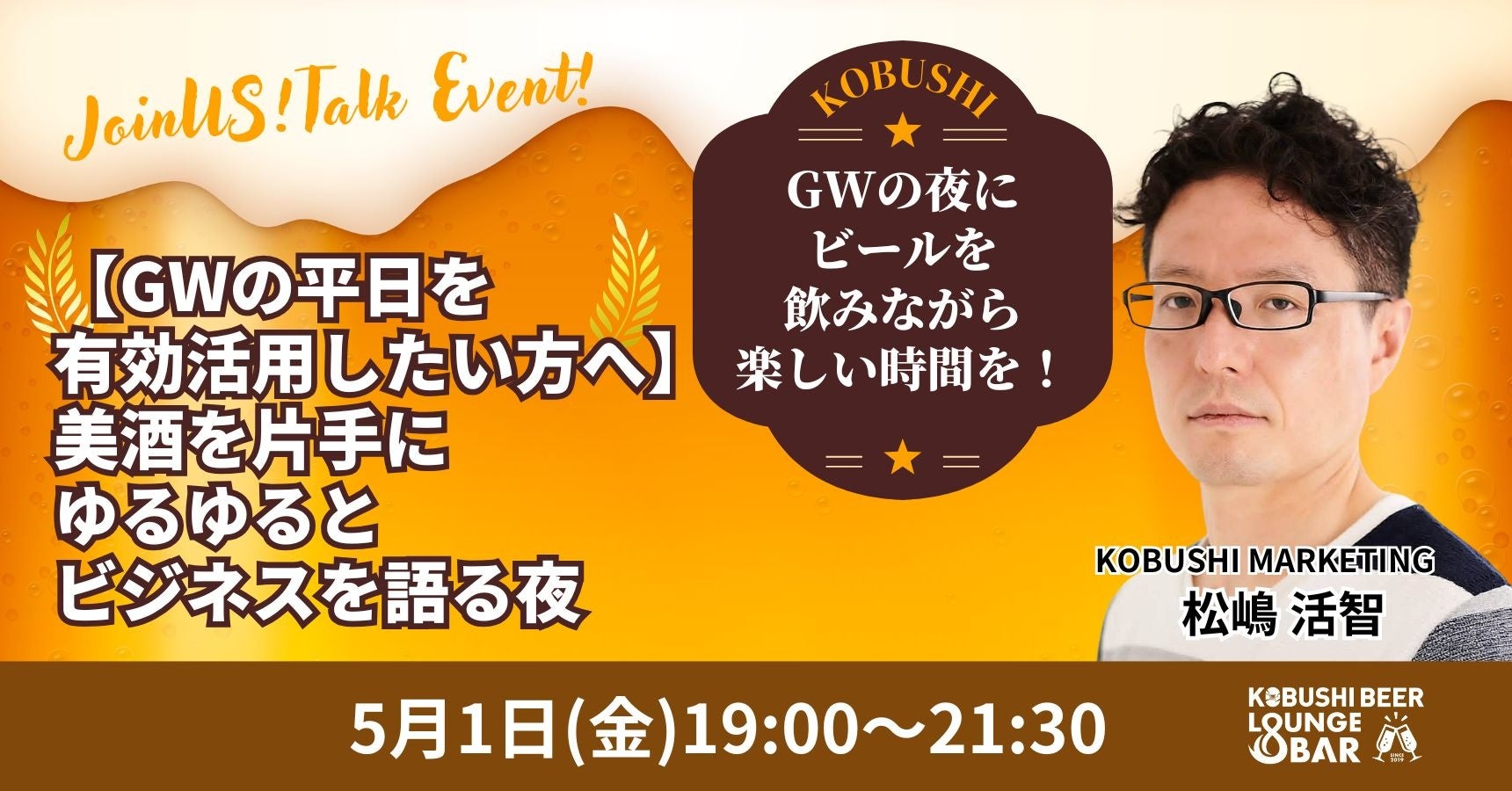 大型連休の谷間となる平日は、「休むには中途半端」「仕事にも集中しきれない」と感じるビジネスパーソンが増えるタイミングです。こうした“時間の隙間”を有効活用し、新たな人脈やビジネスのヒントを得る動きが広がっています。本イベントは、美味しいクラフトビールを片手に、リラックスした雰囲気でビジネスについて語り合うカジュアル交流会。社内外のネットワークを広げたい方や、新しい視点・価値観に触れたい方に向けた場を提供します。当日は、ビジネスマッチングアプリ「Yenta」の元コミュニティマネージャーであり、KOBUSHI BEERの新コミュニティマネージャーに就任した松嶋氏が参加。人と人が深くつながるコミュニティ設計や、関係性を生み出す仕組みづくりについて、実践的な知見を共有します。