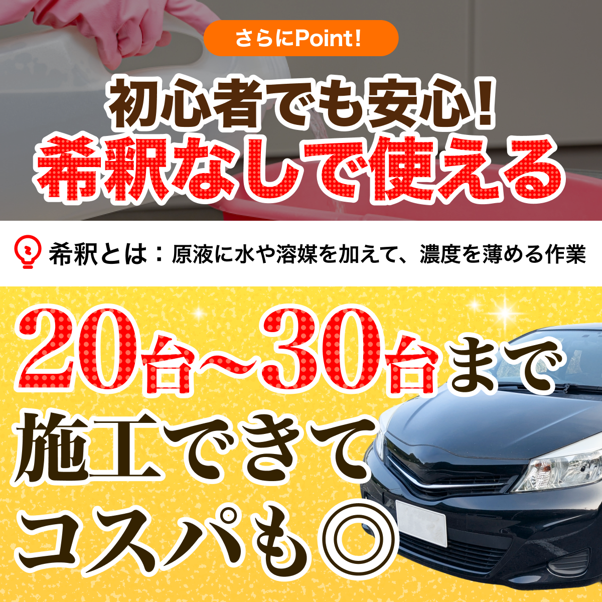 さらに、1本で約20~30台分の施工が可能。希釈の必要がない手軽さに加え、コストパフォーマンスの良さも魅力です。