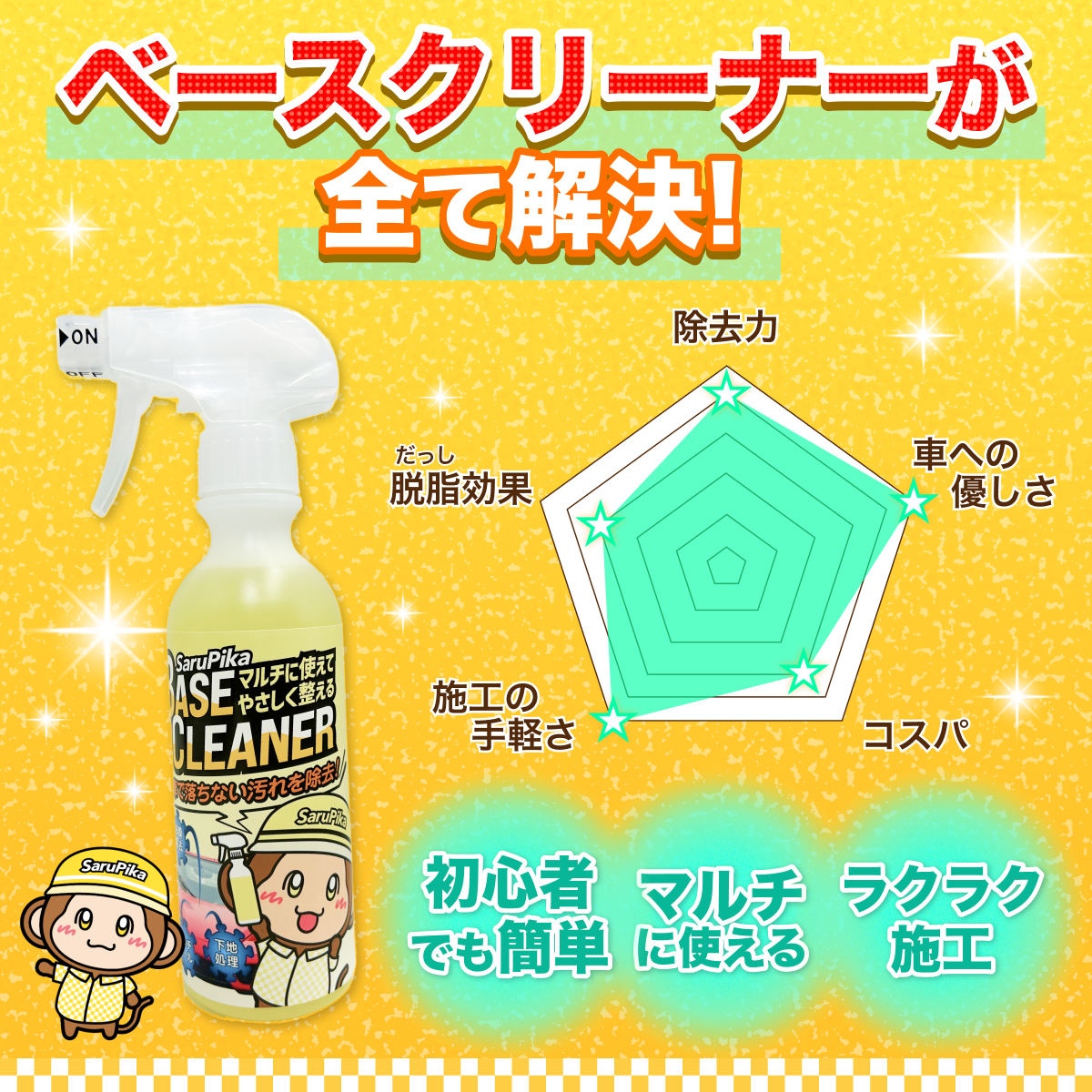 Sarupika「ベースクリーナー」は、日常的な洗車では落としきれない油性汚れや付着汚れに対応するクリーナーとして、洗浄力と使いやすさの両立を図った製品です。