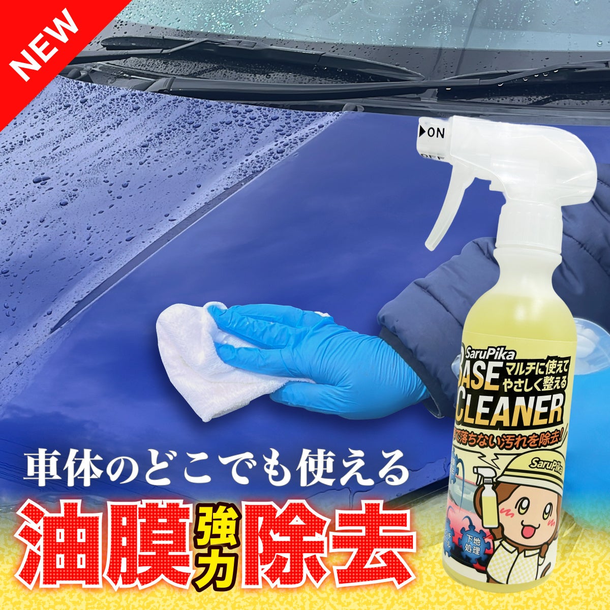 こうした原因のひとつとして考えられるのが、ワックス成分や空気中の油分などがボディやガラスに付着してできる“油膜”です。Sarupika「ベースクリーナー」は、この油膜汚れに着目し、愛車本来の見た目を引き出すための“下地ケア”を、誰でも簡単に行えるよう開発されたクリーナーです。