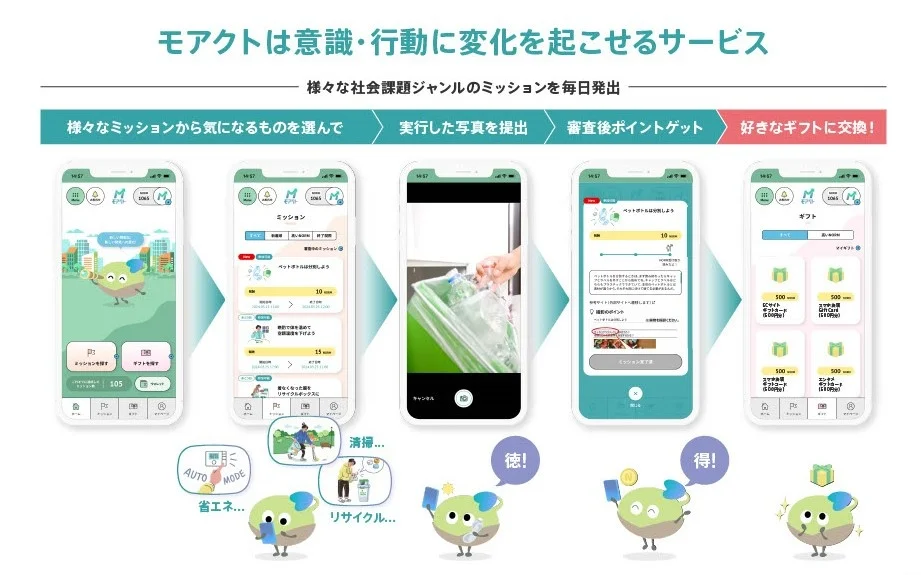 モアクトは、ゼロカーボンをはじめさまざまな社会課題の解決に取り組む企業・団体と生活者一人ひとりを結び、生活者の社会貢献への意識や行動変容を促すサービスです。具体的には、スマートフォンなどでご利用可能なWebアプリ「モアクト」で、社会課題解決につながる幅広いジャンルの”ミッション”(=社会貢献につながる行動)を提供します。
